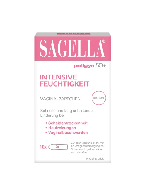 - Sagella® poligyn 50+ Intensive Feuchtigkeit Vaginalzäpfchen sind hormonfreie intravaginale Feuchtigkeitsspender, die entwickelt wurden, um vaginale Trockenheit, Reizungen, Brennen und Dyspareunie (Schmerzen beim Geschlechtsverkehr) zu lindern. Diese Symptome treten häufig in den Wechseljahren auf, können aber auch nach der Geburt oder infolge von Stress, Diabetes oder medizinischen Behandlungen wie Chemo- oder Strahlentherapie vorkommen.
